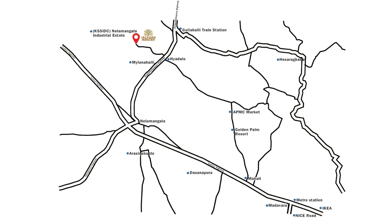 Inchara Farms is a premium 7-acre gated farm community located in Nelamangala and KSSID Industrial Estate. Thoughtfully designed with mahogany plantations, organic fruit cultivation, and modern infrastructure, it offers the perfect balance of eco-friendly living and urban convenience. With wide internal roads, 24/7 security, and excellent connectivity to the metro, highways, and airport, Inchara Farms is not just a home, but also a smart investment for the future.